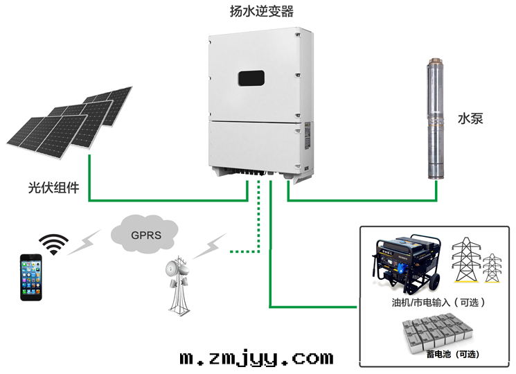 光(guāng)伏扬水(shuǐ)系(xì)統主(zhǔ)要(yào)由(yóu)光(guāng)伏扬水(shuǐ)逆變(biàn)器、水(shuǐ)泵、太陽能(néng)電(diàn)池阵列組成(chéng)。其(qí)中(zhōng):